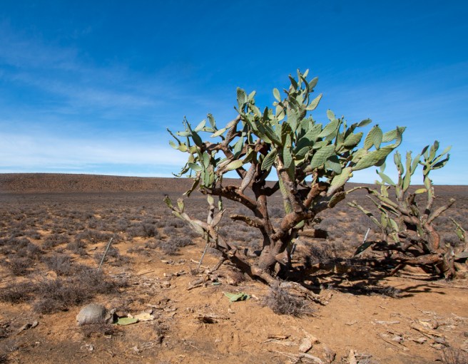 At first glance the land around me looks dry, barren and uninteresting. Normally landscapes and paintings of landscape have something majestic in them or a dramatic focal point that claims the viewers attention. Not here, in a single glance the foreground is initially seen and disregarded and the distant Swartberg range is just a tinge of muted colour shortening the horizon, the small  undulating treeless hills in the middle distance break the two, and that is about as dramatic as it gets – until you look closely to what is right in front of you.